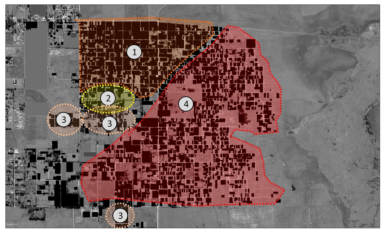 3. Crecimiento urbano en zonas altas: Se detectan dos modalidades de crecimiento por extensión en zonas con bajo riesgo de inundación: los mencionados loteos del programa Pro. Cre. Ar (uno situado en la zona de 650 y 16, y el otro ubicado sobre la calle 22 y 655); y edificaciones en lotes individuales que no son producto de esta operatoria. Principalmente esta dinámica se da entre las calles 650, 657, 13 bis y 17. Aunque ubicada en otra categoría a los fines de esta clasificación, el crecimiento en reemplazo del uso agrícola también se da dentro de las tierras más altas de la zona.