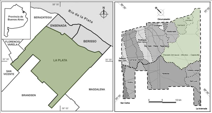 Las cuencas a las que refiere este artículo pertenecen a la vertiente del Río de La Plata, con un rumbo de escurrimiento SO-NE desaguando en la planicie costera, donde los arroyos se vuelven divagantes y generan bañados (Hurtado et al. 2006). Las cuencas situadas en el eje sudeste, cuentan con determinadas potencialidades que las distinguen de otras cuencas del partido con mayor grado de antropización: valores ecológicos y paisajísticos y sectores de las planicies de inundación con escasa o nula ocupación.