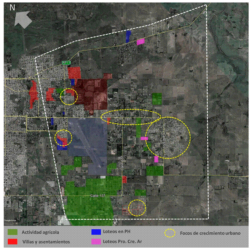 Un análisis por medio de interpretación de imágenes satelitales en el período mencionado, permitió detectar cinco focos de crecimiento urbano en el área, tres de formato centralizado y extensión aproximada de 150 ha (consistente en nuevas ocupaciones), uno lineal sobre la avenida 7 de 2 km de largo, y finalmente, un gran foco correspondiente con los barrios Villa Garibaldi y dentro de él, Parque Sicardi (sobre la cuenca del arroyo El Pescado), el cual totaliza entre áreas de completamiento urbano y nuevos loteos, un área aproximada de 650 ha (Figura 4).