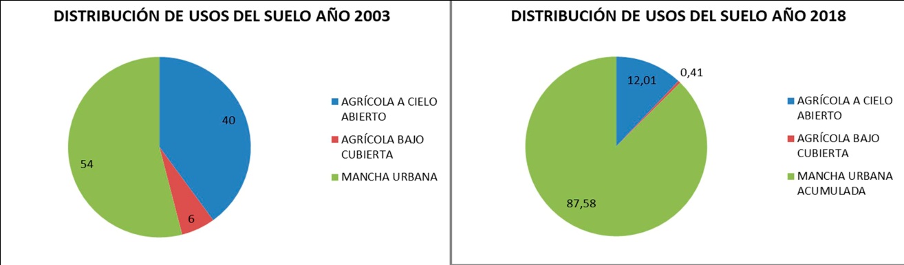 La distribución de usos del suelo indicaba para el año 2003 un 40% de actividad agrícola a cielo abierto, un 6% bajo cubierta, y un 54% correspondiente a la mancha urbana. Para 2018, la distribución de usos del suelo indicaba un 12% de actividad agrícola a cielo abierto, un 0,4% bajo cubierta, y un 87,6% correspondiente a la mancha urbana (Figura 7).