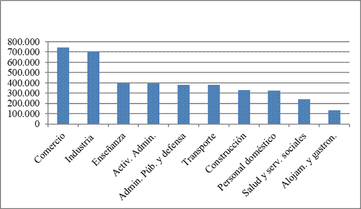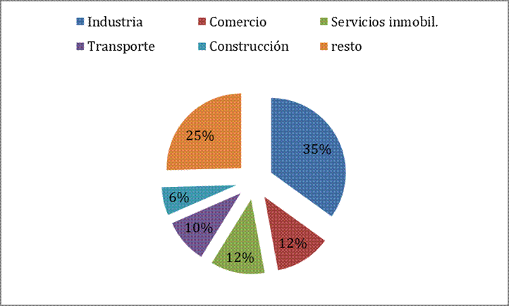 Siete ramas de actividad sobre un total de 15, ocupan a casi 3 millones y medio de trabajadores, el 69% de los ocupados (INDEC- Censo Nacional de Población 2010). La industria, además de tener un peso significativo en el producto, ocupa al 15% de los trabajadores. Las actividades de administración pública y la enseñanza concentran en conjunto el 16%, asumiendo un rol central el sector público como empleador tanto a través del Estado provincial como los Estados locales (Figura 3).