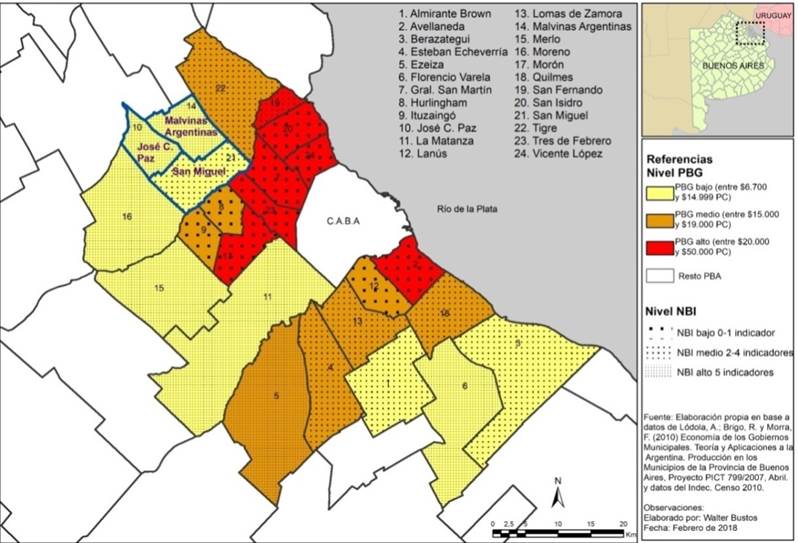 El mapa ilustra en este sentido el grado desigual de desarrollo económico de los 24 municipios/partidos. Dichos distritos fueron clasificados en tres niveles, según el indicador producto bruto geográfico per cápita[6] y en tres niveles, según el indicador de NBI que mide pobreza estructural[7]/[8].