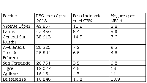 En este plano, se observó por un lado una correlación inversa significativa entre producto per cápita y pobreza estructural. En especial en los partidos “ricos” de ingreso medio-alto, los indicadores de pobreza estructural son bajos, siendo elevados los índices de NBI en los municipios “pobres” o de ingresos bajos. Al mismo tiempo, la mayoría de los partidos de ingreso per cápita medio-alto presentan perfiles productivos con gran peso de la industria y las actividades comerciales.