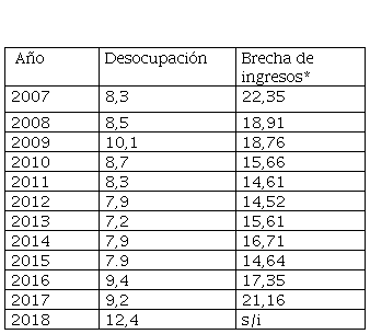 La percepción de ingresos en Argentina históricamente denota una profunda desigualdad socioeconómica. La serie 2007-2018 muestra una primera tendencia hasta 2015 de reducción significativa de la brecha de ingresos entre el decil más rico y el decil más pobre. Con los reparos del caso por la alteración de la medición desde 2007, la reducción de la brecha de ingresos es continua. A partir de 2016 y con datos solo hasta 2017 parecería revertirse la tendencia ampliándose la desigualdad de ingresos percibidos por la población. La desocupación por su parte, exceptuando el año 2009 producto de la crisis financiera internacional, exhibe también una trayectoria descendente en el período 2007-2015 y de reversión a partir de la asunción del nuevo gobierno de Cambiemos en 2016.