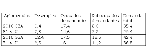 A partir del año 2016, el deterioro de las condiciones de empleabilidad, en combinación con la caída del salario real, lleva a una creciente presión sobre el mercado de trabajo que es particularmente elevada en los partidos del Gran Buenos Aires, en comparación con los 31 aglomerados urbanos del país. La demanda total de empleo, sumando los que no tienen trabajo y los que necesitan complementar ingresos superan el 35% en 2016 y alcanzan el 42.6% en 2018. De modo que prácticamente uno de cada dos trabajadores se encuentra en 2018 en una situación de insatisfacción y necesidad respecto a las condiciones que ofrece el mercado de trabajo.