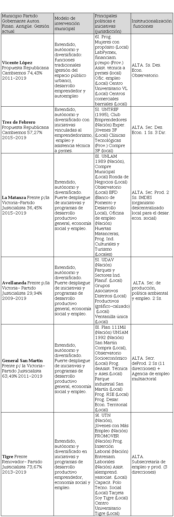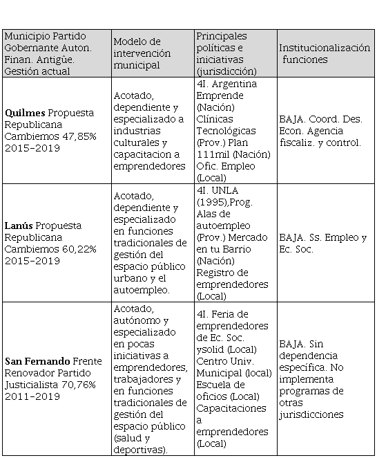 The main objective of this paper is to analyze the productive, labor and institutional dynamics in the recent Argentine urban sphere, in municipalities with a strong industrial profile. To this purpose, we study the impact that recent political changes have on local intervention models on the productive and labor scenario in municipalities that integrate the Greater Buenos Aires, as the main urban agglomeration of the country. We work on the basis of a qualitative methodological approach, through the selection of nine case studies. General San Martín, Avellaneda, Quilmes, La Matanza, Tigre, San Fernando, Tres de Febrero, Vicente López and Lanús, the selected districts, present similar productive profiles with a strong incidence of industry and concentrate 68% of the Gross Geographical Product -GGP- of the Greater Buenos Aires. For this, the following dimensions and analysis variables were considered: i) a socio-productive dynamic (based on the degree of economic and social development, considering the GGP and degree of Unsatisfied Basic Needs - UBN); ii) a labour dynamic (which includes level of unemployment, and level of social inequality), and iii) apolitical and institutional dynamic (degree of local financial autonomy, and local politics/initiatives, that allow us to build intervention models in socioproductive field, in the context opened since national and local political elections in 2015. The cases analysis indicates the following results: in municipalities with an important economic and industrial structure, there are few traditional and narrow schemes of local management for social and productive problems. In fact, extended models are predominant, with strong implementation of own local programs and initiatives. Finally, political party forces in local government scenario have more impact on the diversity of economic actors that policies appoint and invoke in the territory.