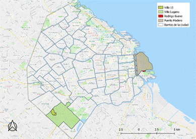 En ese marco seleccionamos dos casos de estudio localizados en barrios con distintas características, con el fin de identificar puntos de contacto y diferencias en cómo se expresa la segregación en cada caso. Por un lado, Villa 15, ubicada en Villa Lugano-Comuna 8, zona sur de la Ciudad, espacio que con el tiempo se consolida como el lugar de residencia de los sectores populares. Por otro, Rodrigo Bueno localizada en Puerto Madero-Comuna 1, una de las zonas más caras de la ciudad, a metros de la zona central.