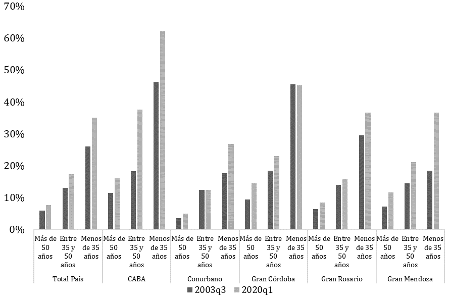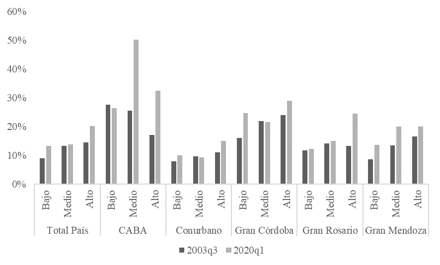 Para la Ciudad de Buenos Aires, la proporción promedio de hogares inquilinos de 2020 representa razonablemente bien los casos en los que el jefe o jefa de familia tiene entre 35 y 55 años, pero en los hogares más jóvenes este guarismo se eleva al 64%. En contraste, las familias con un jefe o jefa de hogar mayor a los 55 años alquilan solo en un 15%. Complementariamente, lo que se puede apreciar es que la inquilinización se incrementa de manera inusitada para los sectores de ingresos medios, duplicándose entre 2003 y los meses previos a la pandemia, en 2020. Independientemente de ello, la población inquilina de la CABA representa aproximadamente un tercio de la población total.