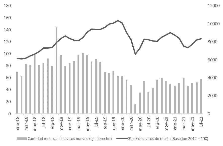 Por otro lado, ya en torno a julio de 2020, momento de inicio de la vigencia de la nueva ley, los flujos muestran una reducción respecto al mes anterior, aún en un contexto de prohibición de mudanzas y prórroga de contratos. Posteriormente, el tercer trimestre de 2020 muestra un crecimiento constante de las nuevas ofertas, que se mantiene en niveles similares a los de principio de ese año. Asimismo, cabe notar que el stock de avisos nunca cae por debajo de la referencia como base 100 de junio de 2012. Incluso todo el primer año de vigencia de la ley el stock se encuentra en niveles promedio equivalentes a los de 2018, y superiores a cualquier momento entre 2015 y 2017[4].