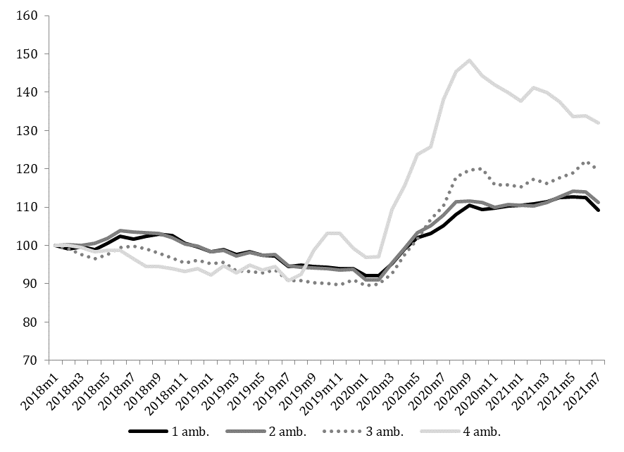 Nuestra percepción es que el cambio de precios relativos se explica de una manera más adecuada por la caída del salario real, que registró una depreciación real de un 14% entre enero de 2018 y el primer semestre de 2021. Por otra parte, vale la pena destacar la heterogeneidad de los precios relativos respecto al tamaño de las propiedades, dado que son las más grandes aquellas que aumentaron su precio en términos relativos. Este aspecto comienza a apreciarse con intensidad a partir de los primeros meses de plena vigencia de las medidas de aislamiento, y puede interpretarse como un resultado de la necesidad de mayores espacios, en consonancia con una alta permanencia de los habitantes en sus hogares a partir del formato remoto del trabajo y la escuela.
