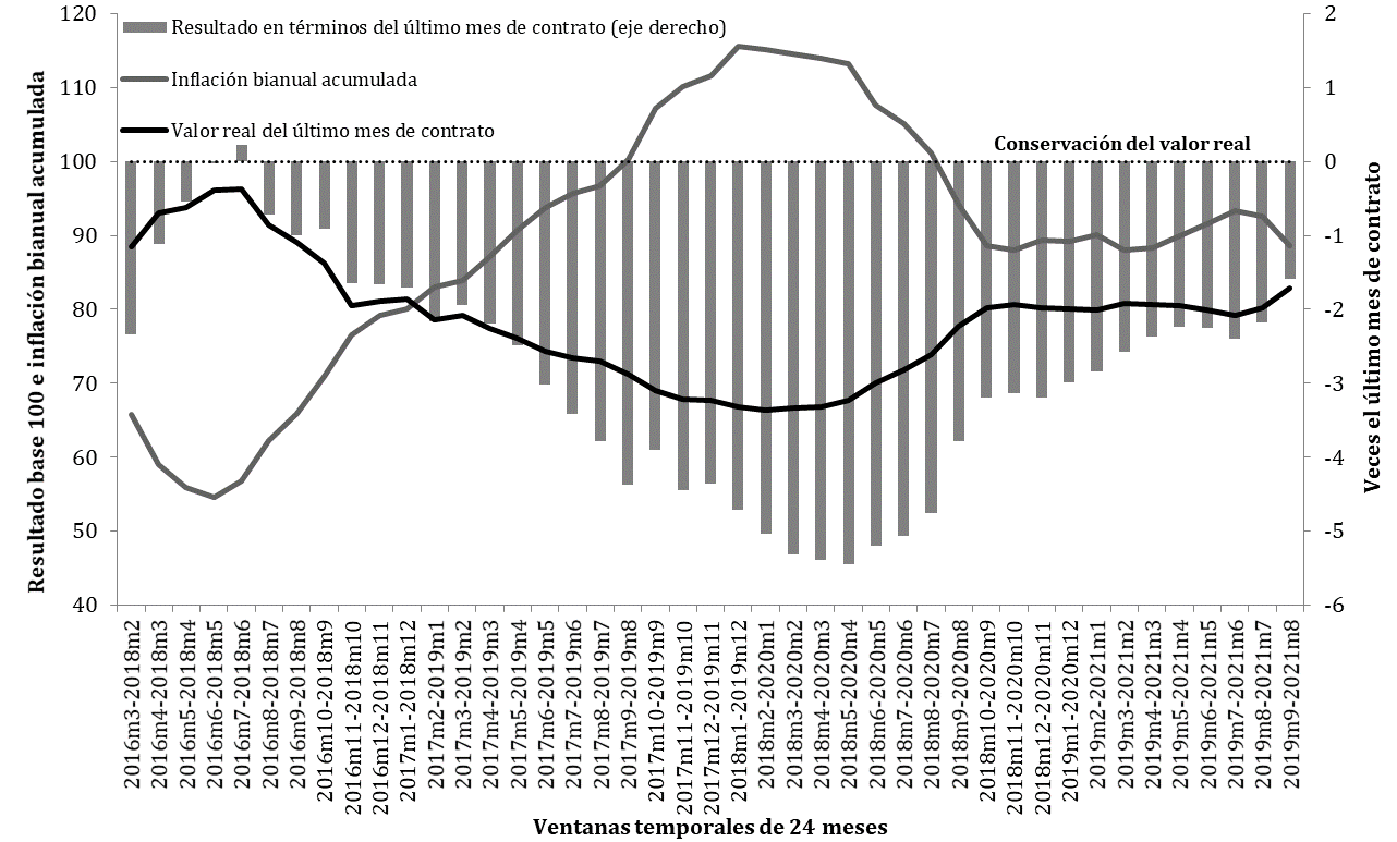 Es en este contexto de una inflación de niveles no vistos desde antes de la Convertibilidad que debemos interpretar el resto del gráfico, que muestra los resultados de los contratos en términos de su ajuste y comparación contra la inflación. Para ello, proporcionamos dos resultados: el primero, representado por el valor real del último mes de contrato, puede resultar el más adecuado para explicar los significativos saltos de precios de los alquileres, ya que permite tener una rápida medida de cuán depreciado quedó el valor en términos reales. El segundo, por otra parte, brinda una medida más integral respecto a la evolución a lo largo de los dos años de contrato, y pone esa medida en términos del último valor del contrato.