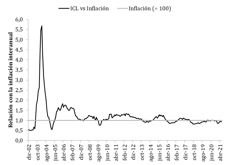 Nos interesa realizar dos tipos de comparaciones para determinar el funcionamiento del criterio de ajuste anual a partir del ICL: primero, comparar cómo hubiese sido su desempeño en relación a lo que el mercado ha decidido ajustar en el pasado; y segundo, cuál hubiera sido su evolución en relación a la inflación.