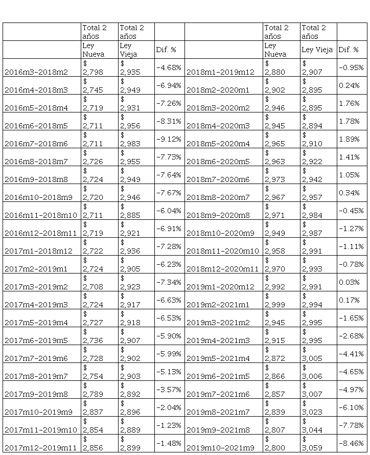 En la Tabla 1 se muestra este primer contraste, donde los montos se encuentran expresados en base 100, debido a que las diferencias en la actualización son independientes del monto inicial del contrato. Es importante destacar que éste no es un contraste contra la inflación, sino entre dos métodos alternativos de actualización. De las 44 ventanas temporales de dos años, más de la mitad se encuentran en torno a un 5% del valor asociado al ajuste vigente antes de la nueva ley, a veces con un valor más alto y a veces con un valor más bajo. El promedio de las diferencias es de un 3.5% a favor del ajuste heterogéneo asociado al mercado desregulado, es decir, una diferencia mínima, a cambio de una eliminación de la instancia de decisión del porcentaje de ajuste basado en la expectativa de evolución de los precios.