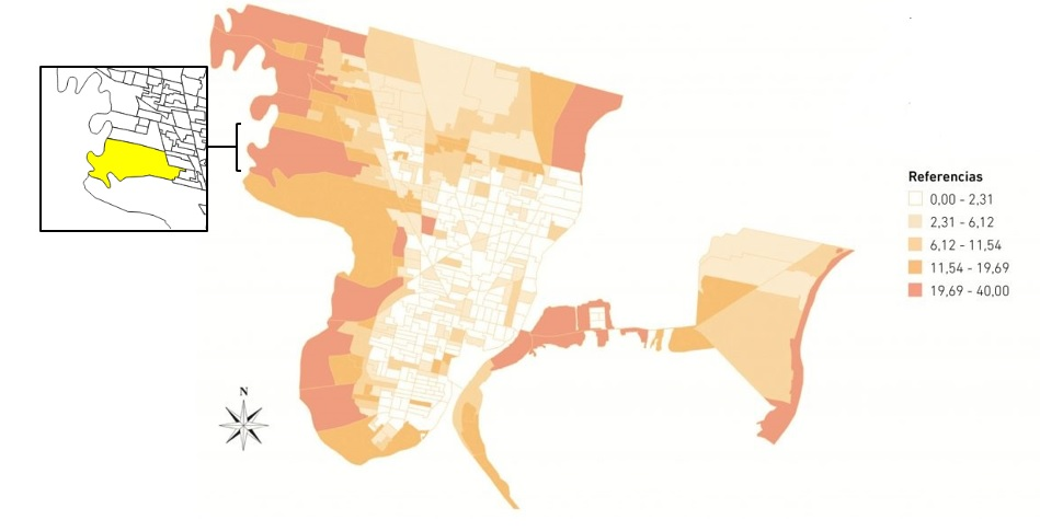 El siguiente mapa representa condiciones socio-económicas en términos de Necesidades Básicas Insatisfechas (NBI) por radio censal, correspondiente al CNPHyV, 2010. En el mismo, se encuentra indicado el emplazamiento de los barrios a los que nos referimos.