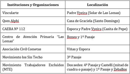 Las organizaciones que tuvieron representación en dicho mapeo fueron: MTE Santa Fe (carreros, miembros de cuadrilla de construcción, encargadas de merenderos); organizaciones indígenas: Comunidad Qom Las Lomas, Comunidad Qom Lashi L´ma Nam Qom, Proyecto Qom Alphi y Mutual Qom; representantes de instituciones del estado provincial: Centro de Atención Primaria Las Lomas, Centro de Alfabetización y Educación Básica de Adultos (CAEBA Nº 112), asociaciones civiles como Asociación Vincularte, Movimiento Los Sin Techos, la Asociación Cometas y la Comunidad Guía Nº 287 Ntra. Sra. Del Rosario del Salado[8].