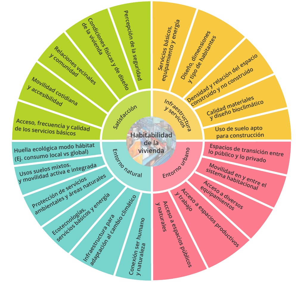 (i) Habitabilidad de la vivienda, infraestructura, y servicios; se refiere a las condiciones de la vivienda, en cuanto calidad de sus materiales y sistemas constructivos, dimensiones espaciales y diseño arquitectónico con enfoque bioclimático —acordes al número y tipo de ocupantes y considerando los espacios privados, semiprivados y públicos, así como a los materiales de la región, la temperatura, la ventilación e iluminación— y del entorno habitacional, en cuanto el asoleamiento, la orientación, los usos del suelo, así como la localización de la vivienda con relación a la infraestructura, equipamientos y servicios que permiten a los habitantes satisfacer sus necesidades en su entorno habitacional (Zulaica y Celemín, 2008:130; Colavidas y Salas, 2015:18).