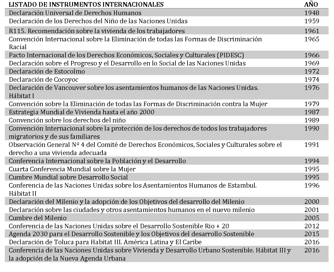 A partir de entonces, este derecho humano forma parte de los postulados de gran cantidad de declaratorias y conferencias internacionales (ver Tabla 1). Este cúmulo de documentos que destacan el derecho a la vivienda adecuada y el desarrollo sostenible de las ciudades, son la base que sustenta los postulados de la Conferencia de las Naciones Unidas sobre Vivienda y Desarrollo Urbano Sostenible conocido como “Hábitat III”, realizado en Quito, Ecuador en 2016 y en la que se proclamó la Nueva Agenda Urbana, (NAU), la cual pone a la vivienda como solución de fondo a los problemas sociales y de desarrollo urbano de los países, por ser incentivo del desarrollo socioeconómico, de generación de empleo y por ser componente de primer orden en la consolidación de comunidades (Topelson, 2017).