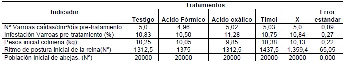 1) Número de Varroas caídas/dm²/día pre y pos- aplicación del tratamiento: El número de varroas caídas/dm2/día pre-aplicación de los tratamientos, fue de 5,04; 4,96; 5,02 y 5,03 para las colmenas pertenecientes a los tratamientos Testigo, Acido Fórmico, Acido Oxálico y Timol, respectivamente, alcanzado un promedio general de 5,01 varroas caídas/dm2/día, lo que significó una población alta de varroas en las colmenas antes de la aplicación de los tratamientos, como se aprecia en la Tabla 1.