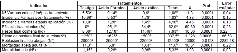 Luego de la aplicación de los tratamientos, se determinó que la utilización del Ácido Fórmico al 85% fue el mejor, alcanzando una eficacia promedio del 95,1% para el control de Varroa destructor, sin afectar a la población de abejas de la colmena, mientras que el tratamiento con ácido oxálico al 10% alcanzó una eficacia promedio de 84,45%, influyendo negativamente sobre las abejas adultas, y para el tratamiento timol al 99% diluido en aceite de oliva se obtuvo una eficacia promedio de 62,8% incidiendo negativamente con mortalidad de la cría.