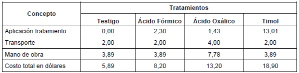 Para la evaluación de costos de la tecnología se consideraron los costos de las aplicaciones/tratamiento sumado a ello el costo de mano de obra y de transporte, el costo total de materiales, mano de obra y transporte están divididos para 4 colmenas ya que en el proceso de investigación los materiales, la mano de obra y transporte se utilizaba en 4 colmenas en todos los tratamientos, dando como resultado un menor costo/colmena tratada para el tratamiento con ácido fórmico al 85% con dos aplicaciones cada 15 días de 8,2 dólares/colmena tratada, seguido por el ácido oxálico al 10% con 4 aplicaciones con intervalo de cuatro días con un costos/colmena tratada de 13,2 dólares, posteriormente el tratamiento timol al 99% diluido en aceite de oliva con dos aplicaciones cada 8 días con un costo/colmena tratada de 18,9 dólares y finalmente el testigo con un costo de 5,89 dólares, costo que toma en cuenta solo el costo de la mano de obra y del transporte para las dos revisiones que duró el proceso investigativo pero al mismo tiempo no se observó una reducción del porcentaje de infestación y más bien se notó un leve incremento, como se observa en la Tabla 3.