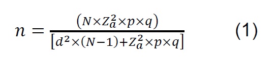 Where n = sample size, N = population size (374,317), Z = confidence level (95%), p = probability of success (0.5), q = probability of failure (0.5), and d = precision (maximum allowable in terms of ratio error) (3.5%), thus was estimated a minimum sample size of 782 females older to 36 months.
