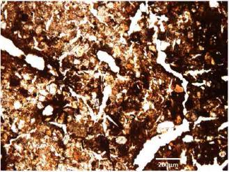 La formación de Histosoles se divide en tres procesos: 1) translocación dentro del cuerpo del suelo, es decir, la paludización; 2) transformación de materiales en el interior del cuerpo de un suelo, la maduración (cambios químicos, biológicos y físicos en los suelos orgánicos después de que el aire penetra en los depósitos orgánicos, haciendo posible que florezcan las actividades microbianas), y, por último, 3) la mineralización, liberación de óxidos sólidos mediante la descomposición de materias orgánicas (8). En la Figura 5 se muestra una microfotografía de una sección delgada en la que se presentan tejidos vegetales frescos y sustancias húmicas en diferentes etapas de condensación en un suelo orgánico de la zona de estudio.