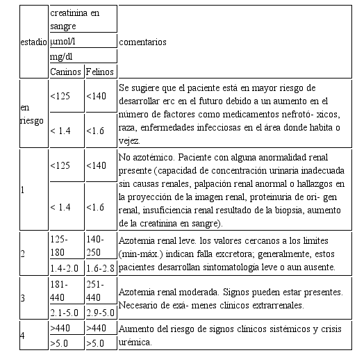 En el caso de la medicina Veterinaria se vio la necesidad de estandarizar la clasificación o estadifiación de los pacientes con erc, diferenciada de la humana; dicha clasificación fue propuesta por la International renal Interest Society (IrIS) (Tabla N.1°), en relación con la progresión de la patología en el paciente, con el fin de establecer un protocolo terapéutico más adecuado y poder aumentar su supervivencia (41).
