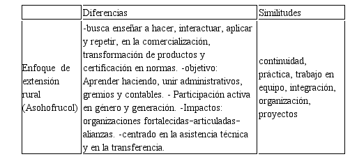 En la Tabla I, se pueden observar las diferencias y similitudes de los enfoques de extensión rural manejados tanto por Asohofrucol como por la universidad de caldas.