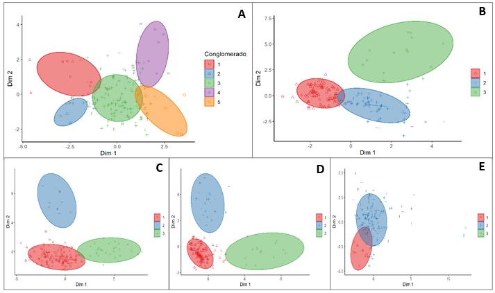 El AC diferenció cinco grupos (Figura 2A). El grupo uno reunió siete accesiones (4.52 %), caracterizadas por la inserción sésil del cotiledón con coloración verde medianamente blanca, forma del cotiledón en copa plana y longitud corta del hipocótilo y crecimiento determinado. El grupo dos con 12 accesiones (7.74 %) presentó el cotiledón en forma de copa y plana, inserción sésil y pedicelada, ausencia de pilosidad y crecimiento determinado. El grupo tres incluyó 97 accesiones (84.35 %) de baja altura (127 ± 2,35 cm), hábito erguido, cotiledón con pilosidad, forma plana e inserción pedicelada y tipo de crecimiento determinado. El grupo cuatro juntó 32 accesiones (20.65 %) con tipo de crecimiento indeterminado, hábito semierecto, ausencia de pilosidad en el cotiledón, porte alto (1,53 ± 0,528 cm), hipocótilo largo (64,35 ± 2,32 mm) y cotiledones cortos (13,86 ± 0.28 mm). El grupo cinco tiene siete accesiones (4.52 %) que se distinguieron por tener hábito de crecimiento semierecto y erguido, tipo indeterminado y determinado, y longitud del cotiledón largo (16,58 ± 0,68 mm).