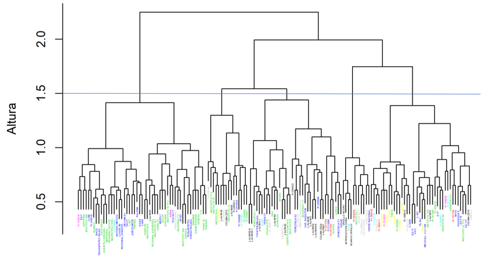 Con el fin de relacionar los caracteres morfológicos con componentes de rendimiento, se seleccionaron las variables discriminantes de acuerdo con las estructuras y formación de la planta, utilizando el coeficiente de determinación (R2) arrojado para las variables cuantitativas y el p-valor de la prueba chi-cuadrado de Pearson para las cualitativas del AC anterior. Un total de 25 variables fueron seleccionadas (Tabla 4). Posteriormente, se realizó un análisis de conglomerados con la distancia de Gower y el método de Ward, utilizando la función myplclust para identificar el color por origen. Los análisis se hicieron con el software R versión 3.4.2 (R Core Team, 2017), empleando los paquetes FactoMineR en el cálculo de los resultados del AFDM, factoextra, cluster y rafalib para el análisis y visualización de los gráficos del AC.