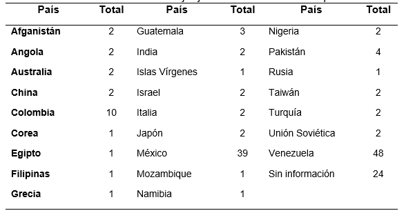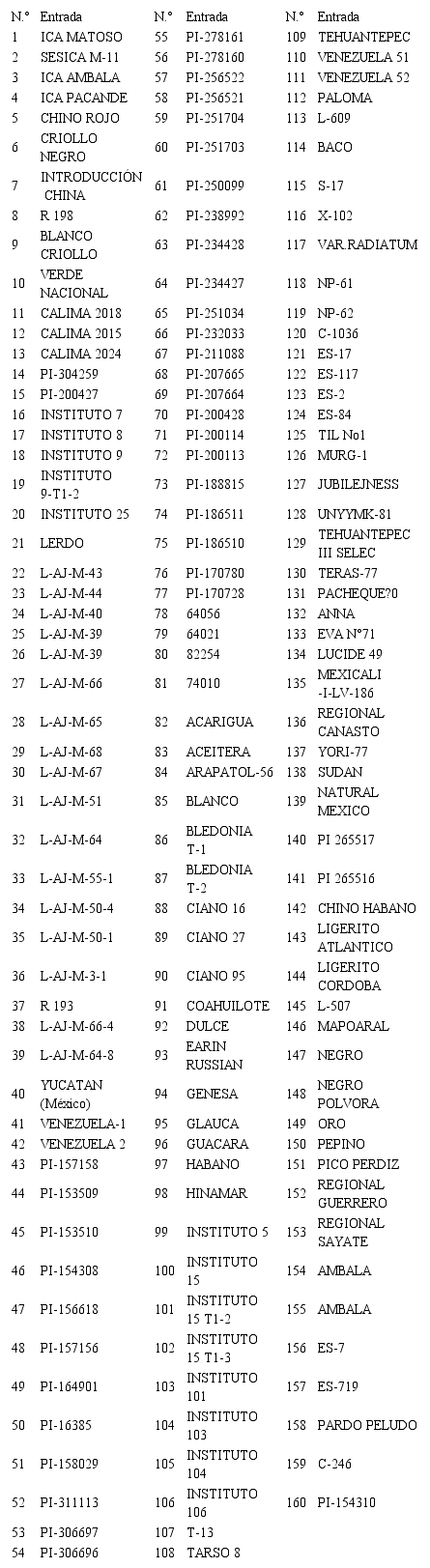Se caracterizaron en campo 160 accesiones (Tabla 1) manejadas por el Sistema de Bancos de Germoplasma de la Nación para la Alimentación y la Agricultura (SBGNAA), clasificadas en las categorías colecciones nacionales, introducciones o variedades, de las cuales, 136 fueron colectadas en 25 países y 24 no tienen información concreta sobre el origen de estos materiales (Tabla 2).
