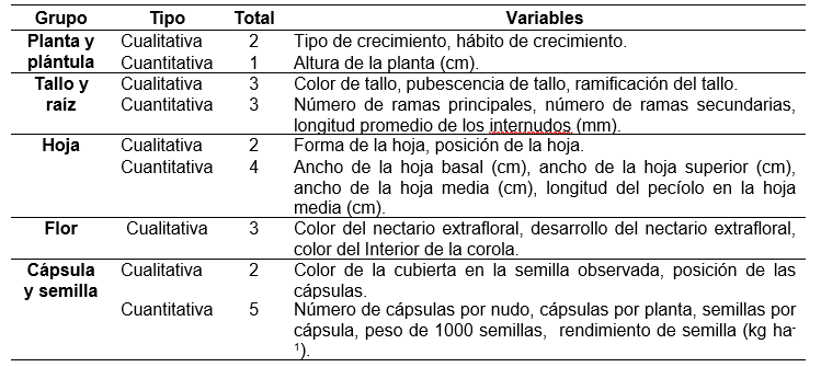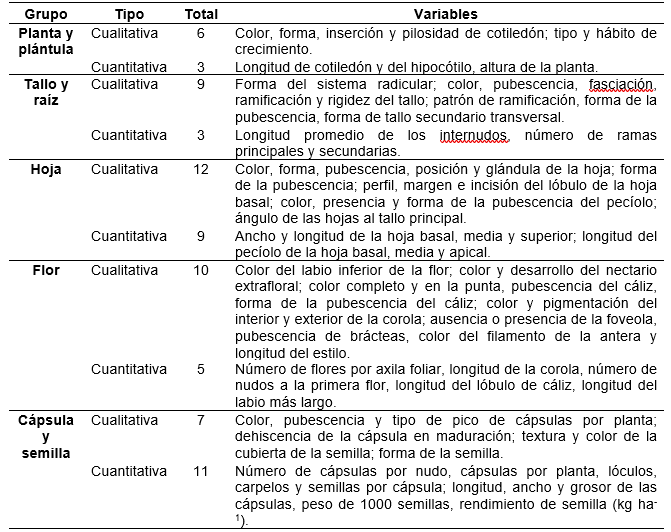 El grupo planta y plántula fue discriminado por hábito, tipo de crecimiento, altura de planta, inserción y pilosidad del cotiledón. De acuerdo con Mustafa et al. (2015), la altura de la planta, número de ramas por planta, número de cápsulas por planta, semillas por cápsula y el peso de 1000 semillas son las características más asociadas a rendimiento. Lo que evidencia la importancia de estas variables en programas de mejoramiento de la especie; de igual forma, Falusi et al. (2015), identificaron la altura de la planta como una característica importante para diferenciar genotipos. En el grupo tallo y raíz se presentaron diferencias en la forma de la pubescencia, altura de la planta y número de ramas primarias. Cristaldo (2007) señala que algunas accesiones se caracterizan por ser glabras o tener pilosidad rala o escasa, y Falusi et al. (2015) identificaron el número de ramas por planta como determinante de la capacidad de carga.