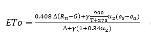 (1)Donde: ETo es la evapotranspiración de referencia en (mm/día); es la radiación neta en la superficie del cultivo (MJ/m2/día); G es la densidad de flujo de calor del suelo (MJ/m2/día); T es la temperatura del aire a 2 m de altura ºC; es la velocidad de viento a 2 m de altura (m/s); es la presión de vapor actual (KPa); es la presión de vapor saturado (KPa); ∆ es la pendiente de la curva de presión de vapor (K Pa/ºC); es la constante psicométrica (KPa/ºC).