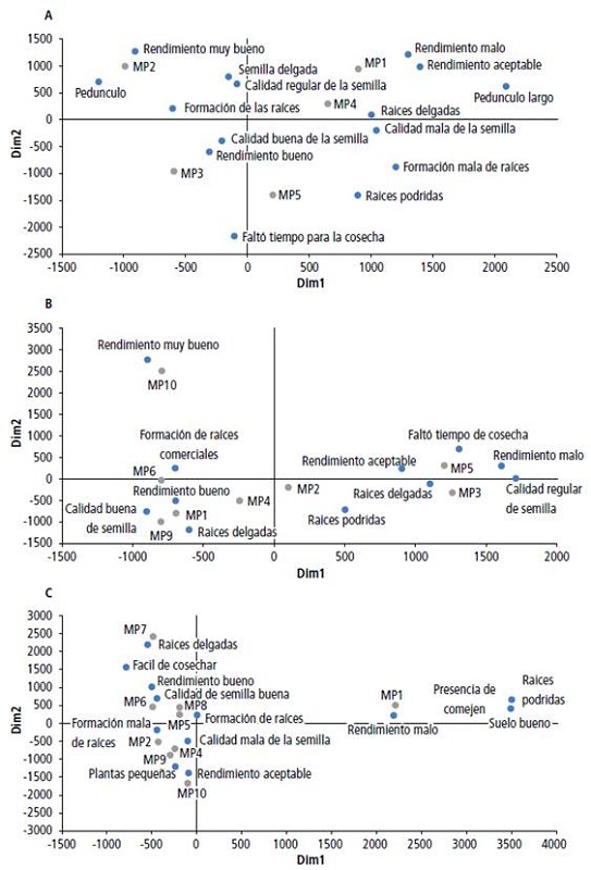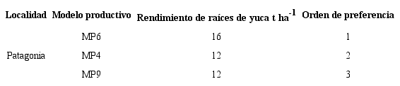 En la localidad de Santo Domingo, la preferencia de los agricultores por el modelo MP2, estuvo principalmente correlacionada con la variedad utilizada (ICA-Costeña), la cual fue catalogada de rendimiento muy bueno, semilla delgada, pedúnculo largo y buena formación de las raíces, lo que consideran muy importante para el mercado en fresco de la yuca. En contraste, el MP1 estuvo asociado a rendimientos aceptables a malos y raíces delgadas. En la localidad de El Reposo, los modelos con la variedad CORPOICA-Orense fueron relacionados con rendimientos muy buenos, buena calidad de la semilla y buena formación de raíces, lo que es considerado de alta importancia para la aceptación del producto final en el mercado. Para el caso de los modelos con la variedad Corpoica-Caiseli, se resaltan los rendimientos aceptables, raíces delgadas y buena calidad de la semilla. En la localidad de Patagonia, asociados a la variedad Corpoica-Tai, fueron considerados de buenos rendimientos, facilidad de la cosecha y buena calidad de la semilla.