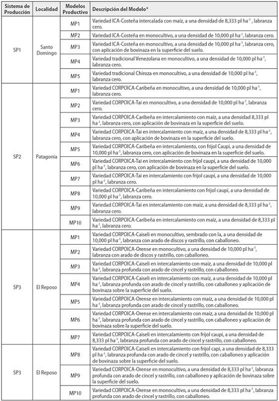Con las alternativas tecnológicas disponibles se construyeron los modelos productivos (MP) para cada localidad, en busca de la solución de las limitantes tecnológicas. Las tecnologías que conformaron cada MP se seleccionaron por discusión y consenso entre agricultores, actores locales e investigadores, y combinaron el conocimiento ancestral de los agricultores y actores locales con la oferta tecnológica (OT) generada por los programas de investigación de las distintas entidades (Agrosavia, CIAT, CLAYUCA, ICA). Para las OT era requisito indispensable contar con procesos completos de investigación (generación, evaluación en centros de investigación y validación en fincas).