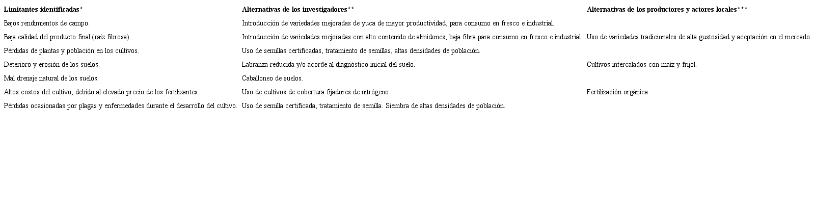 Mediante un primer taller participativo (n=131), se identificaron y priorizaron las limitantes tecnológicas que afectan el cultivo de la yuca en la subregión, considerando las diferentes etapas productivas, desde la siembra hasta la cosecha y la poscosecha. Posteriormente, investigadores, productores y actores locales conjuntamente seleccionaron por consenso diversas alternativas para superar los limitantes tecnológicas identificadas. Dichas alternativas provenían tanto de procesos de investigación como del conocimiento acumulado de los productores y los actores locales (Tabla 1).