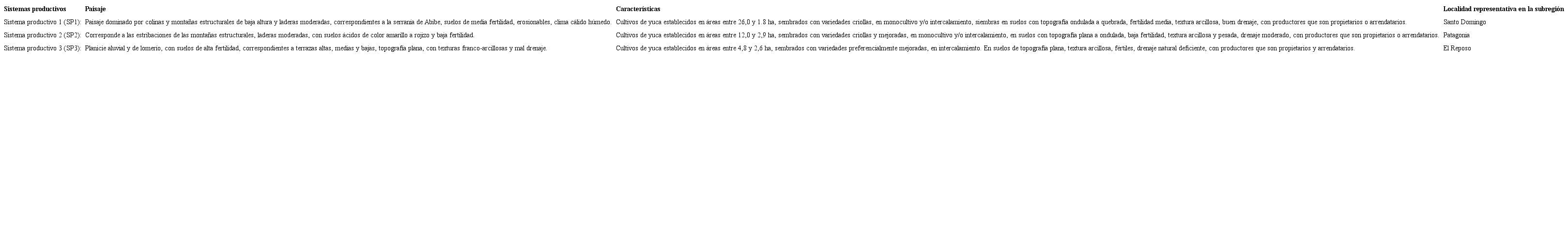 Posteriormente, en un segundo taller se identificaron el entorno y las características de los sistemas productivos de yuca en la subregión. Para ello se utilizaron los mapas de suelos, en donde se ubicaron las zonas productivas de yuca, se identificaron las características de los suelos, topografía, características de los productores, tenencia de la tierra, área promedio de las parcelas, lo cual permitió identificar los sistemas de producción predominantes en la subregión. De igual forma, se identificaron participativamente otros componentes del sistema, incluyendo prácticas de producción, manejo y poscosecha y los modelos de toma de decisiones. Mediante encuestas y entrevistas individuales y grupales se obtuvo el perfil tecnológico de los agricultores. De acuerdo con lo anterior, se identificaron tres sistemas productivos (SP) predominantes en la subregión y las localidades más representativas para cada uno de ellos (Tabla 2).