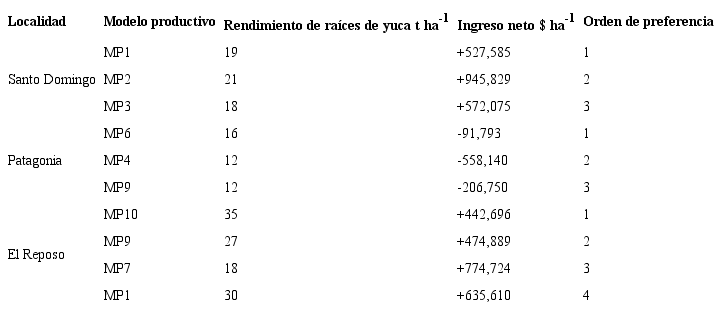 Con base en las evaluaciones realizadas se registró el orden de preferencia de los productores por los MP, mediante regresión logística, identificando los tres modelos de mayor preferencia en cada localidad (Digby, 1978). A los tres modelos preferidos por los agricultores se les realizó un análisis económico conformando patrones de costos de producción, tomando las actividades secuenciales y los insumos que intervinieron, valorándolos a precios del mercado (Martínez-Reina et al., 2019). Con la información obtenida se calcularon los ingresos brutos teniendo en cuenta el valor comercial de las raíces frescas, pagado al productor en la cabecera municipal en la planta de procesamiento de la Fundación Panamericana para el Desarrollo (FUPAD). Los parámetros de costos (directos, indirectos y totales), rentabilidad, valores unitarios y el punto de equilibrio fueron determinados para cada modelo productivo.