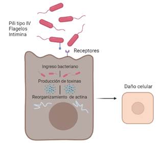 E. colicoloniza el intestino del hombre pocas horas después del nacimiento y es considerada como parte de la microbiota, se describen seis grupos productores de patologías principalmente de tipo gástrico: enterotoxigénica (ETEC) que tiene la capacidad de invadir tejidos gracias a fimbrias y variedad de pilis llamados factores de colonización, el principal mecanismo de daño es la producción de enterotoxinas conocidas cono termolábil (LT) y termoestable (ST) (Cruz et al., 2020); enterohemorrágica (EHEC) productora de enzimas citotóxicas las cuales causan alteraciones a nivel inmunológico y celular, posee mecanismos de adherencia y esfacelación; enteroinvasiva (EIEC) el mecanismo de patogenicidad es la invasión del epitelio del colón por medio de adhesinas y endocitosis celular (Akomoneh et al., 2020; Fu et al., 2017); enteropatógena (EPEC) cuyo principal factor de virulencia es la adherencia localizada mediada por pilis o fimbrias rizadas que se llaman Bfp (bundle-forming pilus) causando daños en las microvellosidades de las células intestinales (Sarowska et al., 2019); enteroagregativa (EAEC) produce daño por medio de la adherencia agregativa, caracterizada por autoaglutinación que se puede dar por fimbrias y la adhesina flexible y por último E. coli de adherencia difusa (DAEC) que presenta una fimbria de superficie, conocida como F1845 y los genes que codifican pueden encontrarse tanto en cromosomas como en plásmidos (Thierry et al., 2020). De igual manera se informan que la presencia o ausencia de algunos factores influyen en el grado de virulencia y por ende de patogenicidad en cepas bacterianas (Alonso et al., 2016).
