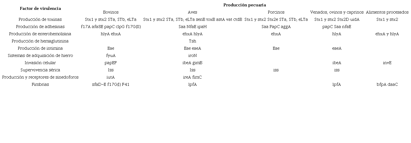 En la producción animal, los factores de virulencia involucrados en patologías intra y extraintestinales que se han estudiado son la adhesión, supervivencia sérica, sistemas de adquisición de hierro, fimbrias, producción de hemaglutinina, enterohemolisina y citotoxina, invasión celular y producción de sideróforos (Varga et al., 2018; Carvajal, 2021).