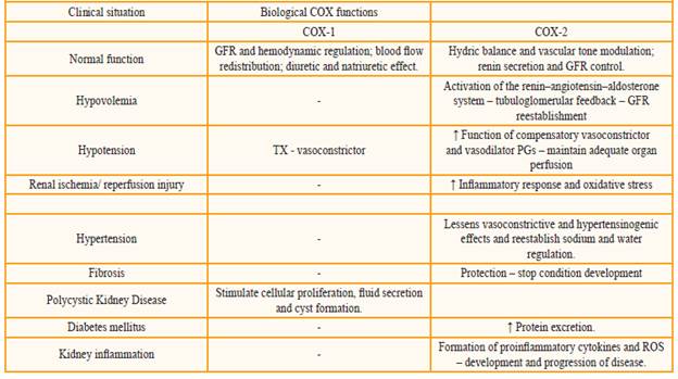 Both COX isoforms play important roles in the regulation of renal homeostasis. However, in different clinical situations, their functions might be altered. Thus, the exactly role of COX-1 and COX-2 and their inhibition by the use of NSAIDs still remains controversial. So, it is important that the health care professional be aware of these possible alterations in order to provide the best clinical course of action.