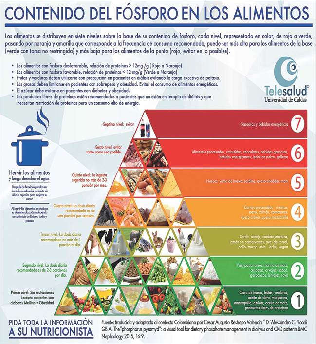 With this in mind, our work group suggests the implementation of an educational tool, adapted for Colombia, derived from the initiative of an Italian group of researchers and published in 2015. They propose a "phosphorus pyramid" to instruct patients, easily, on the foods to avoid because of their high phosphorus content, as well as those they should consume given their state of health44 (Figure 2).