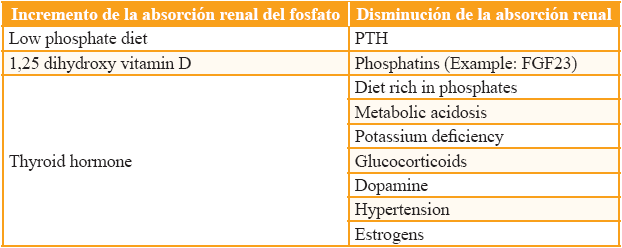 At the renal level, the control of phosphate reabsorption is regulated by these hormonal and metabolic factors[4] (Table 1), modifying the activity of the cotransporters at the proximal tubule level in a matter of minutes, hours or days depending on the type of co-transporter[6,7].