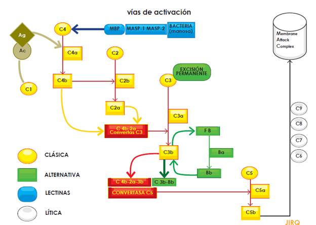 It should be noted that the complement system plays a critical role not only in the defense against infections, but also in the clearance of circulating immune complexes and apoptotic bodies. The system consists of proteins and can be activated through three main pathways (classical, alternative and lectin); activation, regardless of the pathway, leads to protease complex formation. Thus, C4b2a C3 convertase (resulting from either alternative or lectin activation pathways) or C3bBb C3 convertase (produced by the alternative activation pathway), cleave the C3 component into C3a and C3b, the latter being the fraction that binds to the surface of pathogens. Both C3 convertases (C4b-2a and C3b-Bb) bind to another C3b unit to form the C5 convertase, which cleaves complement component 5. In turn, C5b, a fraction resulting from this cleavage, activates pore-forming proteins (C6, C7, C8 and C9) that together form the Membrane Attack Complex (MAC). The fractions not involved in the activation cascade (C2b, C3a, C4a) mediate many biological functions such as opsonization and anaphylatoxin activities (Figure 1) (Figure 1)[5,8,13,14].