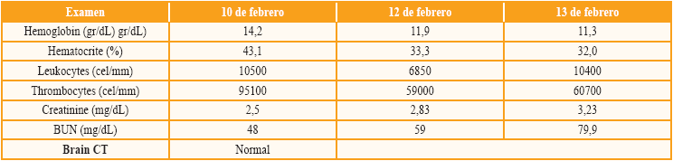 The patient, PJBL, was a 52-year-old man with a past medical history of polycystic kidney disease (diagnosed in 2002), stage 5 CKD in renal replacement therapy, cadaveric renal transplantation (September 11th, 2013), arterial hypertension, hypertensive heart disease (LVEF of 35%), hyperuricemia and benign prostatic hypertrophy. He was referred from Cucuta, approximately 5 months after renal transplantation because of an 8-day clinical picture including disorientation, aggressiveness, bradylalia, bradypsychia, fever, and diarrheal stools. Signs and symptoms were interpreted as a sepsis clinical picture, the cause of which was to be determined. Treatment with linezolid, ceftriaxone, ampicillin and valganciclovir (because of a potential cytomegalovirus infection) was started and routine screening as well as specialized tests were performed to exclude the possibility of neuroinfection (Table 1).