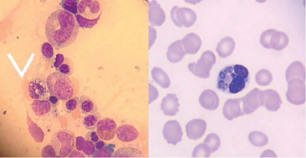 A 78-year-old woman with polycystic kidney disease who had a kidney transplanted 8 months ago from cadaveric donor of extended criteria, and received basiliximab induction therapy and then maintenance therapy with prednisolone, mycophe-nolate mofetil and tacrolimus XL (levels between 5 and 8 ng/mL). She went to the doctor because she was suffering malaise, fever, altered mental status, and cough. During physical examination, she was asthenic, adynamic, pale; her vital signs were blood pressure 100/56, heart rate 105 beats per minute, temperature 38.5 °C; and exhibited fine bibasilar crackles, splenomegaly, graft in the right iliac fossa, no pain on palpation and no skin lesions. Initial paraclinics documented pancytopenia, hypovolaemic hyponatremia, and azotize increase; chest x-ray reported interlobular septal thickening in right hemithorax and serum procalcitonin at 18.5 ng/mL (positive). Hydric resuscitation and antibiotic coverage with cefepime were initiated; however, she did not show improvement and continued with a systemic inflammatory response, so the antibiotic regimen was changed to meropenem; the cultures of blood and urine were negative, but the patient remained febrile and with pancytopenia. Therefore, studies were expanded: lactate dehydrogenase (LDH) 4680 IU/L, ferritin > 40,000 ug/L, triglycerides 544 mg/ dL (high), and fibrinogen 153 mg/dL (decreased) (Table 2), for which hemophagocytic syndrome, probably secondary, was diagnosed. We continued the search for the cause and the peripheral blood smear showed yeast from Histoplasma capsulatum (Figure 1). The diagnosis was subsequently confirmed with the positive Histoplasma urine antigen result at 121.7 ng/mL. Antifungal coverage with liposomal amphotericin B (1 mg/kg for 14 days) was initiated and a bone marrow biopsy was performed which showed blockage in neutrophil maturation, hemophagocytosis and histoplasmosis. In addition, viral load was detected by positive cytomegalovirus (CMV) PCR (polymerase chain reaction) in 18,000 copies, so that intravenous ganciclovir was added.