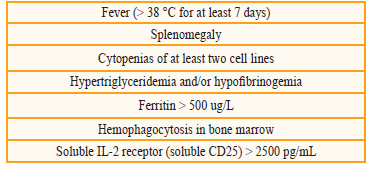 The hemophagocytic syndrome (HPS) is a rare clinical entity caused by increased activation of T lymphocytes, macrophages and histiocytes in liver, spleen and bone marrow that results in hypercytokinemia and alterations of the immune system[1,3]. It can be inherited or acquired[4]. Some secondary causes are immunodeficiencies[5], hematologic neoplasias, and infectious processes with different etiological agents[6]; Epstein Barr virus, cytomegalovirus and fungi, among others. The cardinal symptoms of HPS are: prolonged fever, hepatosplenomegaly, and pancytopenia. High levels of cytokines and ferritin lead to inhibition of erythropoiesis; activated macrophages increase levels of plasminogen activating factor, leading to hyperfibrinolysis, and organomegaly; neurological symptoms and cholestatic hepatitis can be attributed to infiltration by activated lymphocytes and histiocytes[3]. The diagnosis is made based on 5 criteria (Table 1) and treatment is that of the triggering factor[1].
