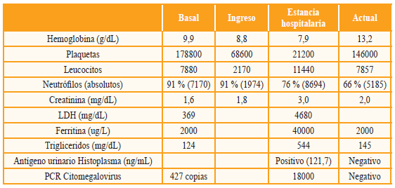 The patient showed favorable clinical evolution, with resolution of pancytopenia, improvement of neurological symptoms and stabilization of renal function. She was discharged and valganciclovir treatment was given until obtaining two viral loads for negative CMV, oral itraconazole 200 mg every 8 hours for 3 days and then 200 mg every 12 hours. After a 6-month follow-up Histoplasma urine antigen remained positive at 2.7 ng/mL. To date, she has completed 1 year of itraconazole treatment with adequate clinical response and clearance of urine antigen.