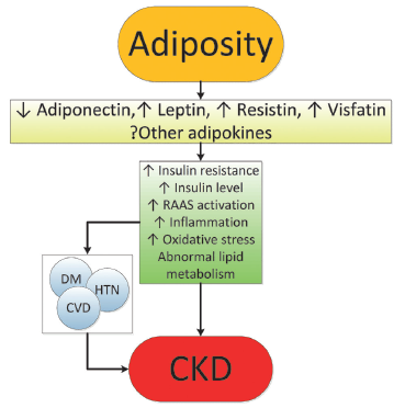 Over the last 3 decades, the prevalence of overweight and obese adults (BMI >25 kg/m2) worldwide has increased substantially.[1] In the US, the age-adjusted prevalence of obesity in 2013-2014 was 35% among men and 40.4% among women[2]. The problem of obesity also affects children. In the US in 2011-2014, the prevalence of obesity was 17% and extreme obesity 5.8% among youth 2-19 years of age. The rise in obesity prevalence is also a worldwide concern,[3,4] as it is projected to grow by 40% across the globe in the next decade. Low- and middle-income countries are now showing evidence of transitioning from normal weight to overweight and obesity as parts of Europe and the United States did decades ago[5]. This increasing prevalence of obesity has implications for cardiovascular disease (CVD) and also for CKD. A high body mass index (BMI) is one of the strongest risk factors for new-onset CKD[6,7].