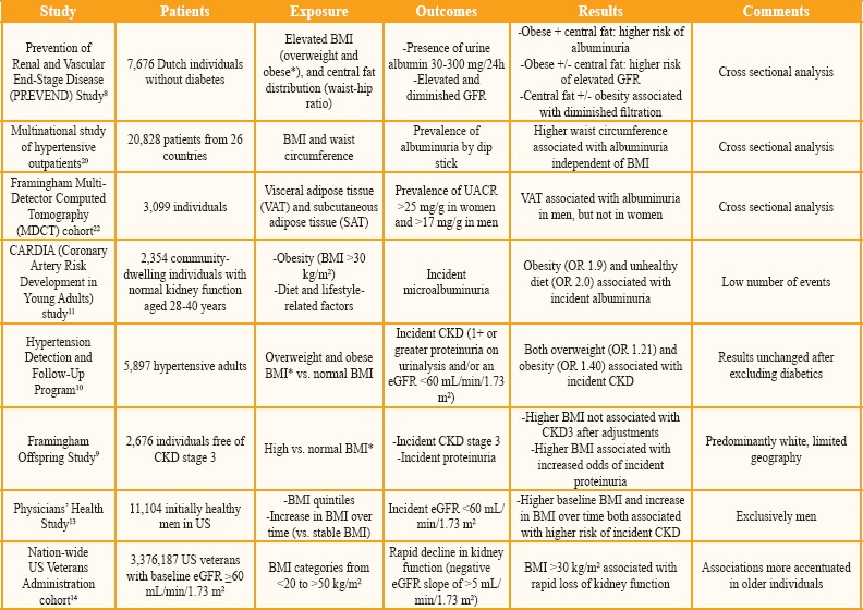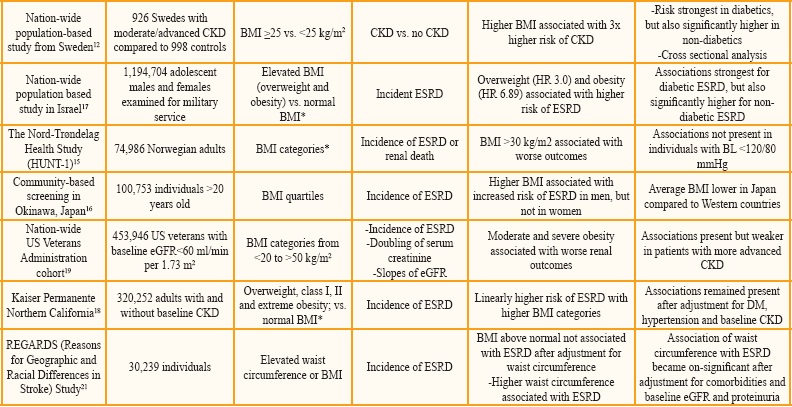 Numerous population based studies have shown an association between measures of obesity and both the development and the progression of CKD (Table 1). Higher BMI is associated with the presence8 and development[9,11] of proteinuria in individuals without kidney disease. Furthermore, in numerous large population-based studies, higher BMI appears associated with the presence[8,12] and development of low estimated GFR,[9,10,13] with more rapid loss of estimated GFR over time,14 and with the incidence of ESRD[15,18]. Elevated BMI levels, class II obesity and above, have been associated with more rapid progression of CKD in patients with pre-existing CKD[19]. A few studies examining the association of abdominal obesity using WHR or WC with CKD, describe an association between higher girth and albuminuria[20], decreased GFR8 or incident ESRD[21] independent of BMI level.